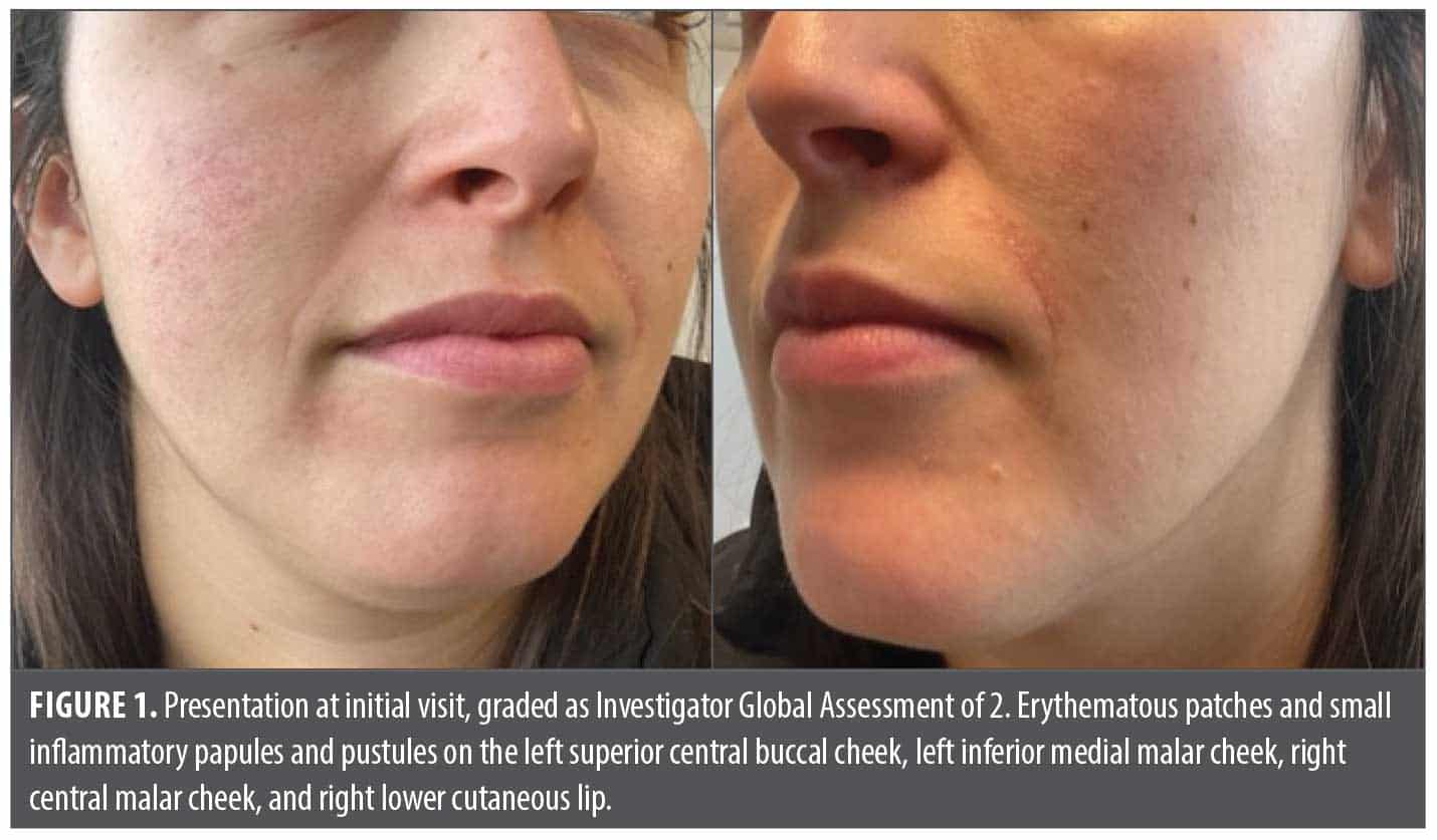 Perioral dermatitis (POD), also referred to as periorificial dermatitis, is a common inflammatory facial dermatosis most often observed in adult women. Small pink erythematous papules, often with a papulopustular and/or papulovesicular appearance, fine scaling, and macular erythema, commonly cluster around the mouth with a distinctive sparing of the vermilion border.1 Involvement may also cluster around the eyes and nose.2 While women aged 20 to 45 years are predominantly affected, POD can also affect children.3 A burning sensation may accompany POD in adult patients.3 The pathogenesis of POD is poorly understood; however, topical, intranasal, inhaled, and oral corticosteroids have been implicated in this condition.1 While chronic corticosteroid use may cause a more severe presentation, the exact pathophysiology is unknown.1 Other causes include cosmetic products such as makeup, sunscreen, and toothpaste; physical factors; and microorganisms such as Fusobacterium, Demodex mites, and Candida albicans.1,3 The diagnosis of POD is made clinically, rarely requiring histologic evaluation for confirmation.3 Histopathology reveals spongiosis, lymphocytic exocytosis, edema, and lymphocytic perivascular infiltration.1,3 While POD may be self-limiting and is not associated with systemic disease, many patients desire treatment due to the visible facial lesions and frequent symptomatology.3 The severity varies among patients, and, without treatment, it can become chronic and recurrent.2 An individualized treatment approach is based on severity, age, and concomitant conditions. In general, topical corticosteroids should be discontinued and potential contact allergens identified and avoided whenever possible.1,2