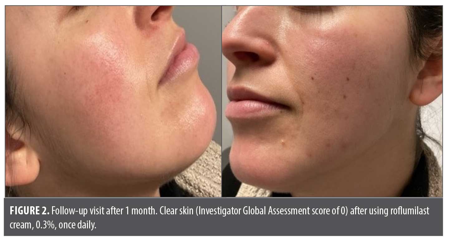 No adverse reactions were noted. In clinical trials of topical roflumilast cream, 0.3%, the most commonly reported adverse events occurring in at least 1% of patients were diarrhea, headache, insomnia, nausea, application site pain, upper respiratory tract infections, and urinary tract infections.4 The patient was instructed to use the product as needed for any recurrences of POD and to follow up if persistent or frequently recurrent. As of 11 months after initial treatment, the patient has not had recurrence of her POD.