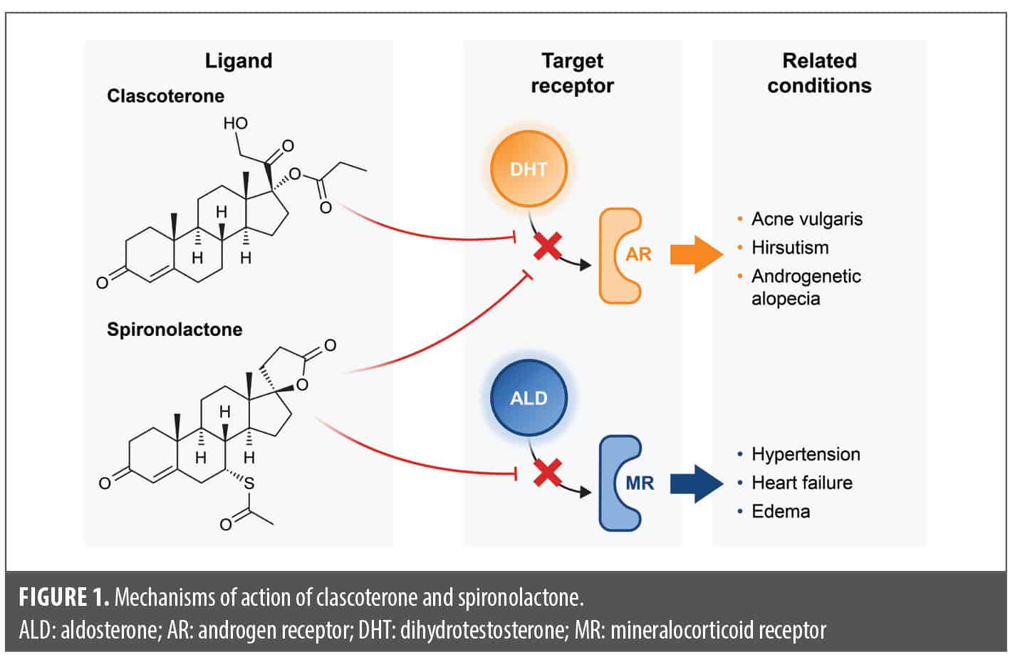 Although clascoterone and spironolactone have similar chemical structures with a 4-ring backbone similar to that of DHT,29,45 these compounds differ somewhat in their mechanisms of action (Figure 1) and are not considered to be substitutable with each other for clinical use.46 Whereas both clascoterone and spironolactone competitively inhibit DHT binding to androgen receptors within sebaceous glands,4,5,38 spironolactone also exhibits activity at aldosterone (ie, mineralocorticoid) receptors, by which it additionally regulates blood pressure and potassium levels.2,45 Systemically administered spironolactone is associated with an increased risk of hyperkalemia, particularly in patients with impaired renal function or those using concomitant drugs that increase potassium,45 although evidence suggests minimal risk of hyperkalemia in young, healthy patients.47,48 There are currently insufficient pharmacokinetic data to determine whether topical spironolactone is safe for use in patients for whom systemic spironolactone is contraindicated or those at elevated risk for adverse effects associated with systemic spironolactone. Additional data are needed on the safety profiles of topical spironolactone and flutamide, particularly the potential for systemic adverse reactions. Additionally, compounded topical spironolactone products prescribed to patients for acne treatment may differ from each other and from published formulations. Clinicians and patients should be informed of the potential differences between topical spironolactone products and clascoterone when considering optimal treatment options.