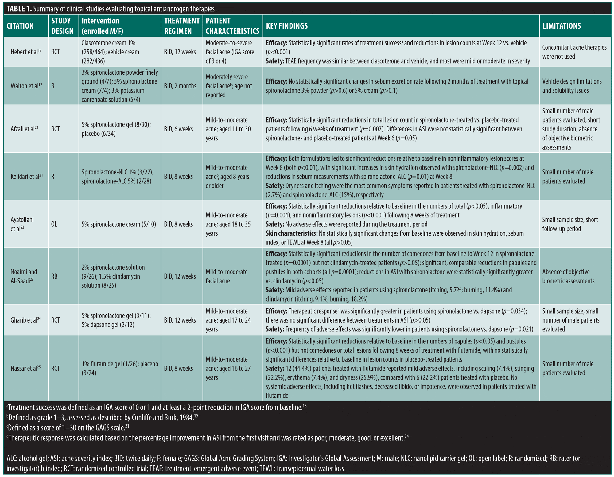 - Hebert A, Thiboutot D, Stein Gold L, et al. Efficacy and safety of topical clascoterone cream, 1%, for treatment in patients with facial acne: two Phase III randomized clinical trials. JAMA Dermatol. 2020;156(6):621-630.