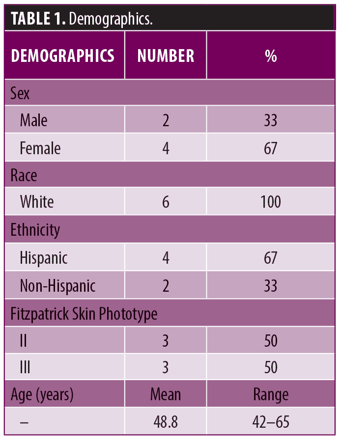Six participants (4 females and 2 males) with a mean age of 48.8 years (range 42–65 years old) and Fitzpatrick Skin Phototypes II and III were consented and enrolled (Table 1).