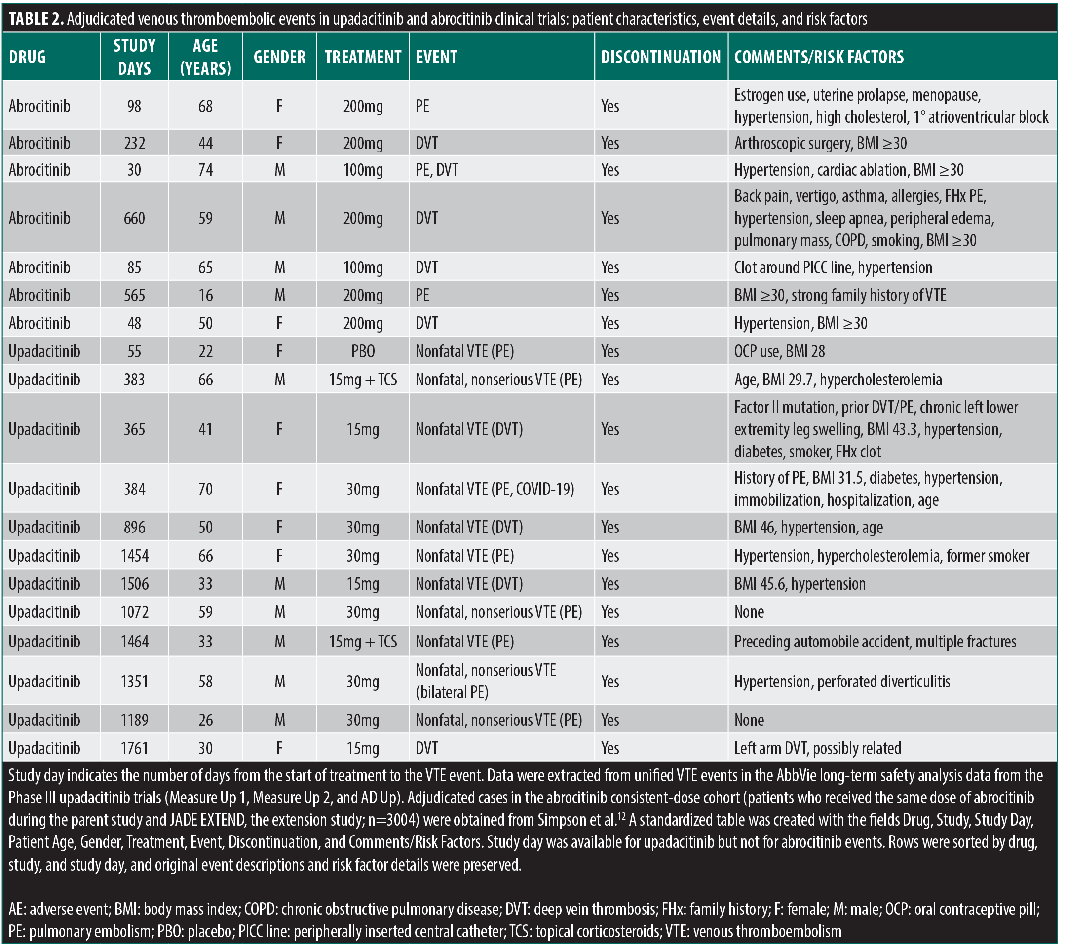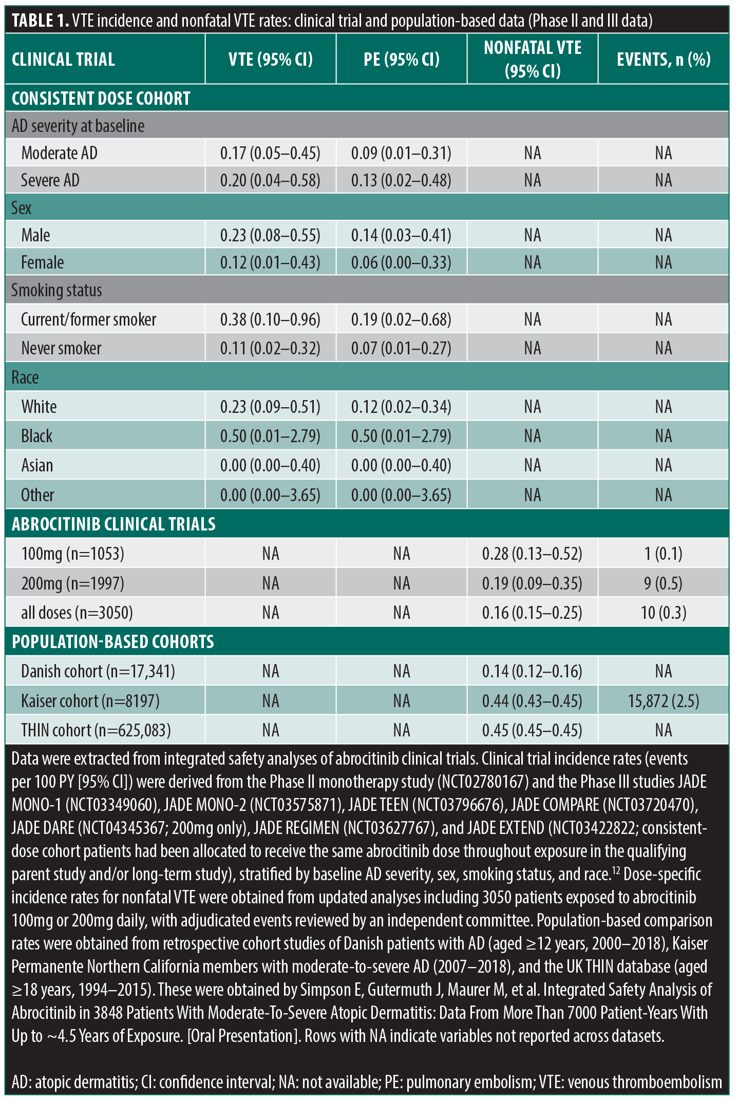 A total of 1384 female patients were in the abrocitinib JADE clinical program (including data from the Phase II monotherapy study and the Phase III studies: JADE MONO-1, JADE MONO-2, JADE TEEN, JADE COMPARE, JADE DARE, JADE REGIMEN, and JADE EXTEND). Of them, 405 (29.3%) were taking OCPs. Among OCP users, 78 (19.3%) were current or former smokers, and none developed VTE over 4.5 years (Table 1).7,8